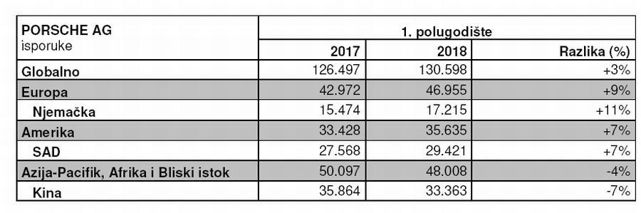 Zadržao se pozitivan trend: Sa 130.598 isporučenih vozila u cijelom svijetu Porsche AG je u prvih šest mjeseci 2018. još jednom nadmašila dosadašnje brojke iz prethodne godine za tri posto. Time je prvo polugodište 2018. godine najuspješnije u povijesti tvrtke. Procentualno je najviše porasla isporuka Panamera: Do konca lipnja Porsche je isporučio 20.500 primjeraka ovog sportskog vozila s četvora vrata – što je gotovo dvostruko više nego u istom razdoblju prethodne godine. Dvoznamenkastu stopu rasta zabilježila je i 911-ica s plusom od 28 posto na 21.400 vozila. Serije s najvećim volumenom isporuke i dalje su Macan s 46.600 isporučenih jedinica i Cayenne s 28.700 vozila.