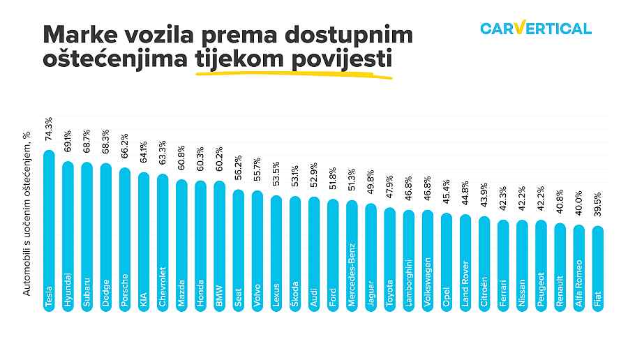 Tesla zauzima prvo mjesto među najoštećenijim markama automobila – 74,3 % provjerenih izvješća o povijesti za Teslu imalo je evidenciju o oštećenjima, a odmah iza su Hyundai (69,1 %) i Subaru (68,7 %). Renault (40,8 %), Alfa Romeo (40 %) i Fiat (39,5 %) su tri marke automobila s najmanje oštećenih vozila. Razlog takvih razlika često se može logički objasniti. Renault i Fiat uglavnom nude povoljne automobile s manjom snagom koji su ekonomični i odlično služe kao obiteljski ili automobili za svakodnevnu vožnju. Hyundai nudi pristupačne, ali „kul” modele, koji su odlično rješenje za mlade i neiskusne vozače. Subaru automobili općenito su sigurni i pouzdani, ali vozači često ne znaju kako upravljati vozilima s pogonom na sva četiri kotača u opasnim situacijama. S druge strane, Teslini su modeli skupi i opremljeni sigurnosnim sustavima, ali vrlo je malo ljudi naviknuto na njihovo gotovo trenutačno ubrzanje.
