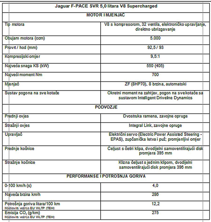 Top performanse: Jaguarov 5,0-litarski benzinski motor V8 s kompresorom, snage 550 KS ima izmijenjenu krivulju momenta koja ima vršnu vrijednost od 700 Nm te pogoni F-PACE SVR do veće najveće brzine od 286 km/h, uz nižu emisiju i smanjenu potrošnju goriva