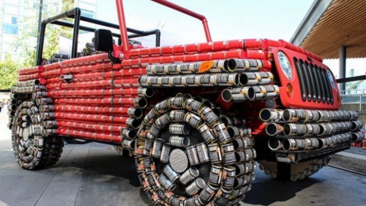 Skupljate povratnu ambalažu? Radujete se povratnoj naknadi od 50 lipa? Kada već skupljate povratnu ambalažu možete napraviti nešto slično kao na fotografijama. Mogli biste izraditi automobil od praznih limenki bilo kojeg pića. Na fotografijama je Jeep Wrangler napravljen od praznih limenki soka od rajčice, ali jednako dobro mogu poslužiti prazne limenke od bilo kojeg drugog pića, samo da su jednakih dimenzija i da se koloristički uklapaju u konačni rezultat.