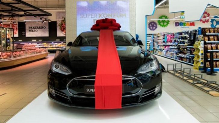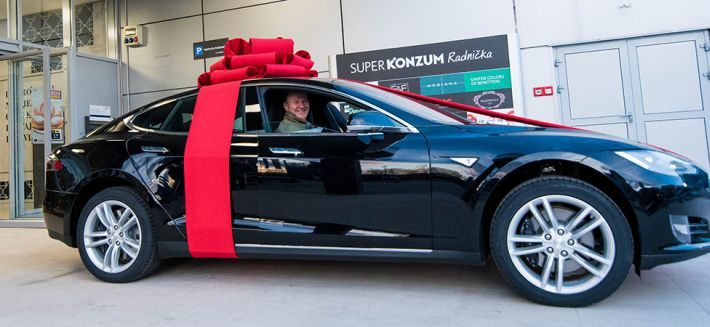Automobil Tesla S, glavna nagrada podijeljena povodom otvorenja Super Konzuma Radnička u Zagrebu, službeno je predan novom vlasniku. Krešimir Kovač iz Zagreba preuzeo je ovu vrijednu nagradu, a kako je izgledao izlazak Tesle iz same prodavaonice i predaja ključeva sretnom dobitniku, pogledajte na fotografijama.