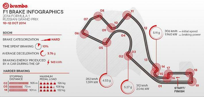 Objavljujemo grafiku tvrtke Brembo, svjetskog proizvođača automobilskih kočionih sustava, a koji je i dobavljač kočnica za velik broj bolida Formule 1. Brembo je iskoristio svoje podatke koje bilježi tijekom F1 utrka pa je za utrku za VN Rusije na stazi u Sochiju dao točne podatke iz kojih se lako vidi koliko su kočnice bolida F1 na toj stazi opterećene. Ova utrka je za kočnice okarakterizirana kao teška. Tijekom utrke koči se oko 10 posto od ukupnog vremena provedenog na stazi, a prosječno usporenje (deakceleracija) je 3,76 g, a tijekom cijele utrke se u kočnicama tijekom usporavanja generira energija od 143 kWh.