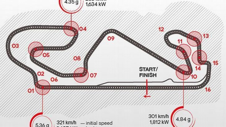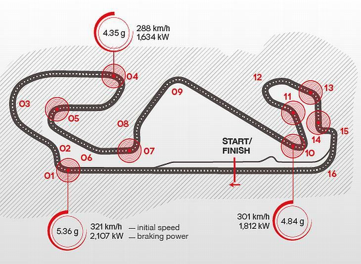 Na priloženoj ilustraciji lijepo se vide tri najteža trenutka, odnosno zavoja za kočnice na VN Španjolske. U prvom zavoju nakon startno-ciljne ravnine koči se pritiskom na pedalu od 113 kg, koči se od brzine 321 km/h uz snagu na pedalu od 129 kg i zaustavni put je dugačak 78 metara pri čemu je deakceleracija 5,36 g i stvara se snaga od 2,107 kW. U 4. zavoju snaga na pedalu je 111 kg, koči se od brzine 288 km/h i zaustavni put je dugačak 64 metara pri čemu je deakceleracija 4,35 g i stvara se snaga od 1,634 kW. Treća teška točka je kočenje u 10. zavoju snagom na pedalu kočnice od 118 kg, koči se od brzine 301 km/h i zaustavni put je dugačak 110 metara pri čemu je deakceleracija 4,84 g i stvara se snaga od 1,812 kW. Pogledajte i video…