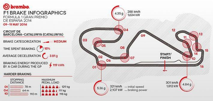 Objavljujemo grafiku tvrtke Brembo, svjetskog proizvođača automobilskih kočionih sustava,a koji je i dobavljač kočnica za velik broj bolida Formule 1. Brembo je iskoristio svoje podatke koje bilježi tijekom F1 utrka pa je za utrku za VN Španjolske na stazi Circuit de Barcelona – Catalunya dao točne podatke iz kojih se lako vidi koliko su kočnice bolida F1 na toj stazi opterećene. Ova utrka je za kočnice okarakterizirana kao srednje lagana. Tijekom utrke koči se oko 15 posto od ukupnog vremena provedenog na stazi, a prosječno usporenje (deakceleracija) je 3,81 g, a tijekom cijele utrke se u kočnicama tijekom usporavanja generira energija od čak 119 kWh.