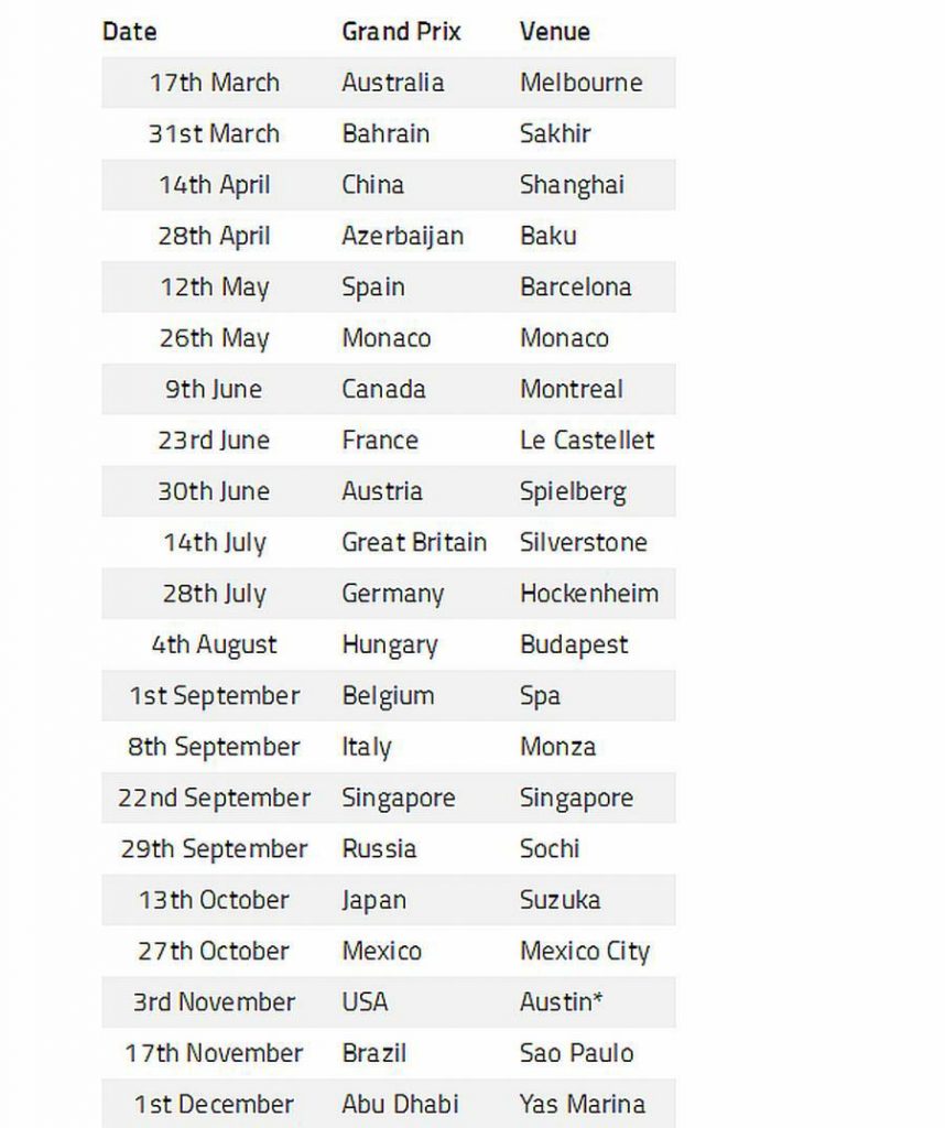 Međunarodna automobilistička federacija (FIA) objavila je službeni kalendar utrka Formule 1 za 2019. sezonu. U sezoni 2019. Formula 1 vozit će se 21 utrka, jednaki broj kao i 2018. godine. Kao i ove godine, tako se prva utrka Formule 1 u sezoni 2019. vozi u Australiji, a Bahrain i Kina zamijenili su mjesta na drugoj i trećoj poziciji. Isto tako svoje mjesto zamijenile su utrke u Meksiku i SAD-u. Novih utrka u kalendaru nema. Sezona tradicionalno počinje 17. ožujka u Melbourneu, a završava 1. prosinca u Abu Dhabiju.