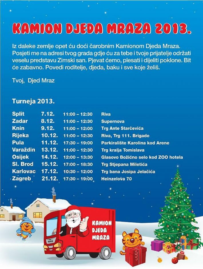 Kamion Djeda Mraza i ovog će prosinca, četvrtu godinu za redom, uveseljavati djecu diljem Hrvatske. Na putu dugom 2.750 km zaustavit će se u 10 gradova Hrvatske i biti pozornica vesele predstave 'Zimski san'. Turneja počinje svečanim ispraćajem Kamiona Djeda Mraza u petak, 6.12. između 13 i 14 sati ispred Poslovnog centra, Heinzelova 70, u Zagrebu. Već sljedeći dan 7.12. – subota, Kamion dolazi u Split, a nakon čega će posjetiti Zadar (8.12.), Knin (9.12.), Rijeku (10.12.), Pulu (11.12.), Varaždin (13.12.), Osijek (14.12.), Slavonski Brod (15.12.), Karlovac (17.12.) i vratiti se u Zagreb (21.12.). Najave, događaji, puno fotografija i videa s turneje bit će dostupno za lajkanje i komentiranje na Facebooku: http://www.facebook.com/KamionDjedaMraza i YouTube kanalu: http://www.youtube.com/user/AutoHrvatskaTV