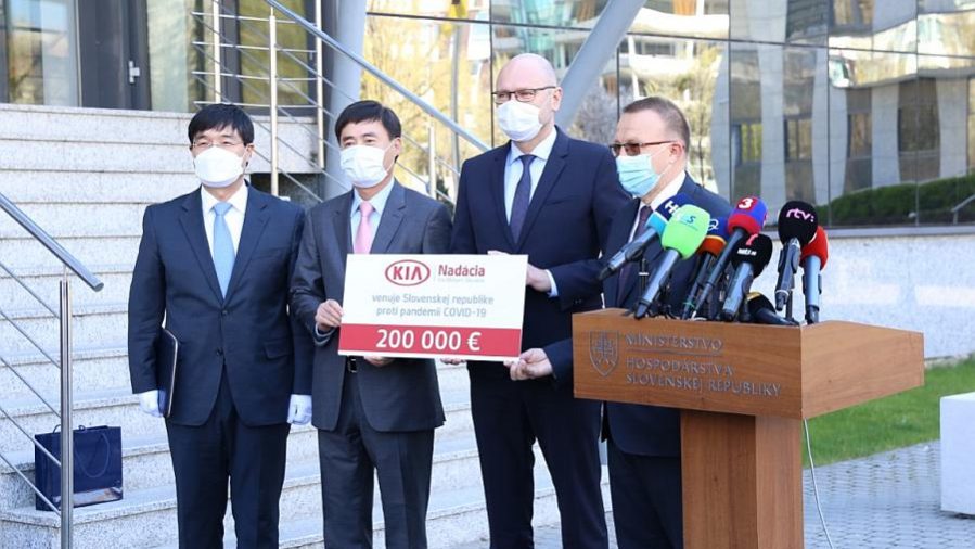 Kijina slovačka fondacija donira 200.000 € bolnicama za nabavku respiratora. Kia Motors Slovakia, jedan od najvećih poslodavaca u slovačkoj regiji Žilina je tamošnjoj vladi donirao 200.000 eura za nabavku respiratora. Donacija je obavljena na svečanosti, gdje je Kyong Jae Lee, predsjednik Kia Motors Slovakia, predao ček u vrijednosti 200.000 eura Richardu Sulíku, zamjeniku premijera i ministru gospodarstva Slovačke. Donacija je namijenjena kupovini medicinskih uređaja koji su potrebni zaraženim koronavirusom, kao i za nabavku zaštitne opreme za zdravstveno osoblje i starije stanovnike žilinske regije. Više od 140.000 eura za nabavku nove opreme za sveučilišnu bolnicu u Martinu.