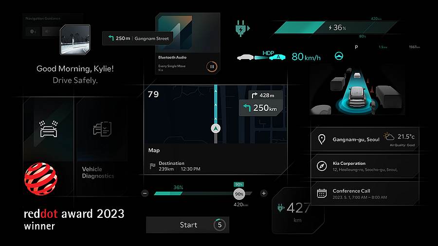 Tvrtka Kia Corporation nedavno je osvojila dvije nagrade za dizajn Red Dot: za svoju filozofiju dizajna izložbe i događaja, te za funkcije Connected Car Navigation Cockpit (ccNC).