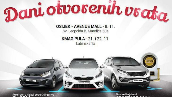 KIA organizira 'Dane otvorenih vrata' u Osijeku i Puli, a na kojima se može razgledati kompletna gama vozila koja KIA ima u prodaji. Uz testne probne vožnje za potencijalne kupce, organizira se i prodaja rabljenih vozila, a ako želite prodati ili pod račun kod kupnje novog KIA automobila dati svoj stari automobil, na raspolaganju vam je besplatna procjena rabljenih vozila. Ako kod kupnje novog automobila KIA odlučite pod račun dati svoj stari automobil bit će Vaše rabljeno vozilo vrednovano više za do 7.000 kuna. Isto tako vrši se i otkup vozila bez obaveze kupnje. Organiziraju se i nagradne igre, a 'Dani otvorenih vrata' održavaju se 8.11.2014. u Osijeku, Avenue Mall, Sv. Leopolda B. Mandića 50a, te 21./22.11.2014. u Puli, KMAG Pula, 11. Labinska 1a.