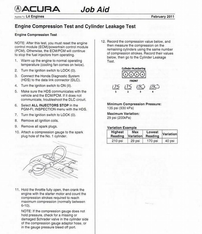 Ispitivanje kompresije je točno ono što detektira u kakvom je stanju motor. Ako je kompresija slaba motor ima malo konja, ne radi dobro i puno troši goriva i ulja, dakle ishaban je i na kraju svog životnog vijeka. No, kompresija u sva četiri cilindra mora biti podjednaka, već odstupanje kompresije u samo jednom cilindru u odnosu na ostala tri cilindra znači da motor radi pod opterećenjem i kako s njim nije u redu. Za očekivati je kako će kompresija u sva četiri cilindra biti podjednaka i jednako niža od originalne kada je motor bio nov, a razlika u izmjerenim kompresijama pojedinih cilindara treba biti minimalna i u tvornički dozvoljenim granicama. Istrošenost se odnosi na karike (klipni prstenovi), stijenke cilindra, ventile, dosjede ventile i druge važne dijelove motora. Opće je poznato kako motor radi ispravno ako ima tlak veći od 100 psi (6,89 bara) po cilindru, ali bi istovremeno trebao imati, što je još važnije , izmjerenu razliku tlaka u pojedinim cilindrima manju od 10 posto. No, dosta teorije, da vidimo praktične rezultate testiranja stare Acure.