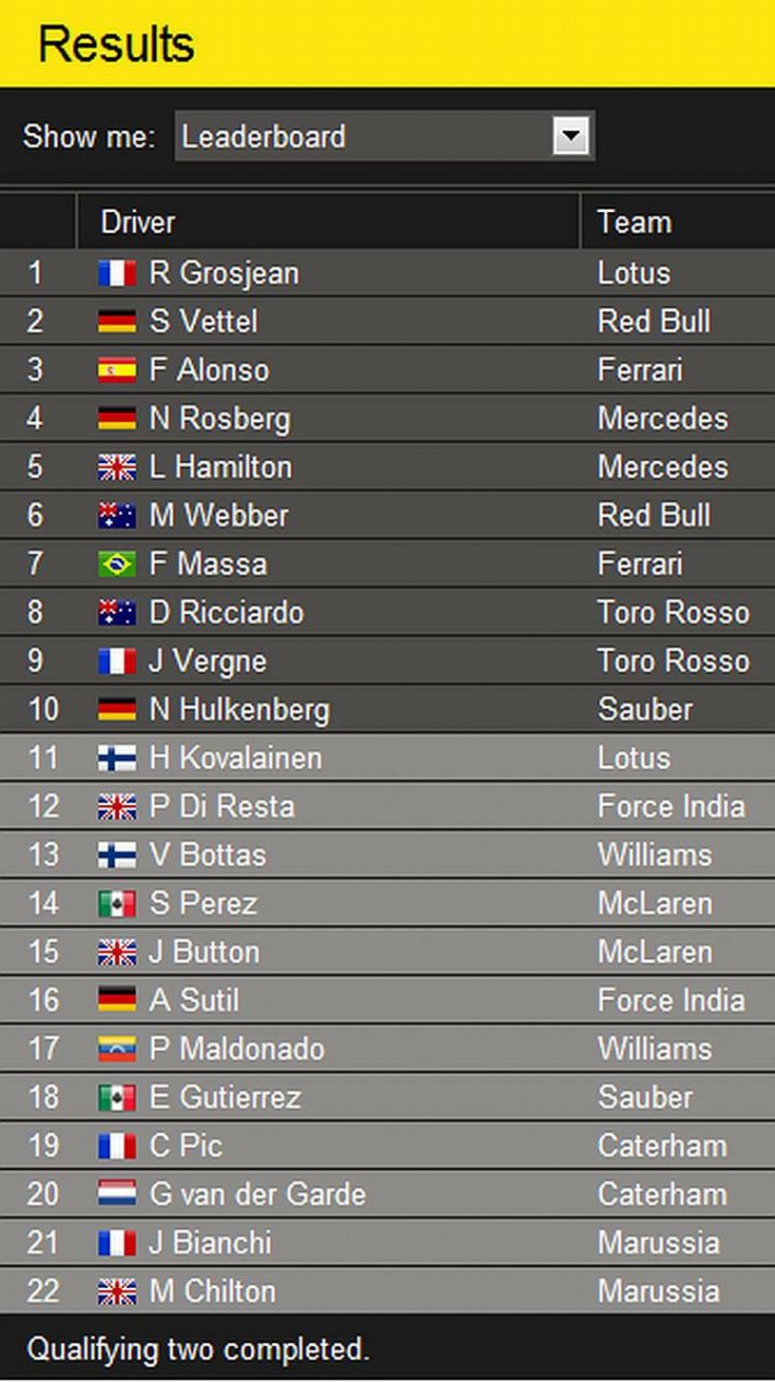Kvalifikacije za utrku Formule 1 u Brazilu su trenutačno prekinute zbog jake kiše i puno vode na stazi u Interlagosu koja je potopljena. Hamilton je bio najbrži u Q1, a Grosjean u Q2. Poznati su rezultati prve dvije runde kvalifikacija (pogledajte priloženu tabelu). Završna runda odgođena je zbog izuzetno jake kiše i puno vode na stazi, tako da konačan poredak prvih 10 za sada nije poznat. U tabeli su rezultati završetka druge runde kvalifikacija).