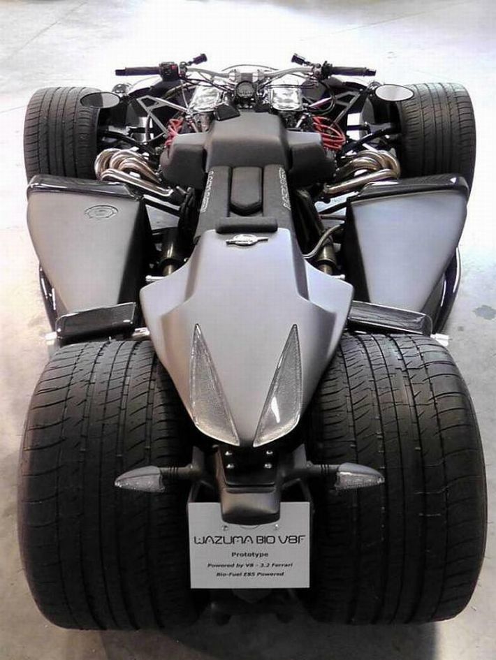 Lazareth Wazuma BIO V8F je odista neobična vrsta vozila, kako oblikom, tako i konstrukcijom. Wazuma BIO V8F je cestovni quad koji ima široke kotače, sprijeda jako razmaknute a straga puno manjeg traga kotača, a uz vrlo malu duljinu izgleda kompaktno, nabito, ali i prekratko. Podsjeća nas na oblikom podsjeća na mini Batmobile. Zanimljivo je kako Wazuma BIO V8F pokreće Ferrarijev 3,2 V8 motor, a za prijenos snage na stražnje kotače koristi se BMW M3 mjenjač. S ovakvim predispozicijama i originalno neobičnim oblikom karoserije koji daje agresivan dojam očekivale bi se i performanse na razini super automobila. Najveća brzina je samo 240 km/h, a konstruktori nisu rekli zašto je tako ‘spor’, je li to zbog sigurnosti i kratkog međuosovinskog razmaka ili se ‘tajna’ krije u korištenju biogoriva, odnosno biobenzina E85. Velike valjke od kotača koče Brembo diskovi. Lazareth Wazuma BIO V8F košta astronomskih 190.500 eura, što je najmanje 20 puta više od normalnog quada za cestu, pa je pitanje kako opravdati taj poveliki iznos.