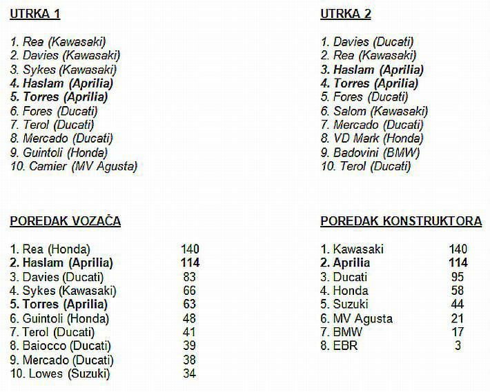 Vikend na stazi Motorland de Aragon završio je s mjestom na podiju i potvrdom dugog mjesta u poretcima vozača i konstruktora za Aprilia Racing – Red Devils tim. Leon Haslam, nakon osvajanja Superpole pozicije u subotu, dovezao je svoj RSV4 do trećeg mesta u drugoj utrci i za malo ispustio podij u prvoj utrci. U jutarnjoj utrci, engleski vozač morao se nositi s niskim temperaturama s kojima se već borio dan ranije. To se negativno odrazilo na performanse guma i odvojilo ga od vodeće grupe. Poslijepodne, na toplijem asfaltu, Leon je od starta s prve pozicije igrao na sigurno u prvim krugovima, da bi ubrzao tempo i započeo borbu s Reom. Koliko se žestoko Haslam borio najbolje pokazuju stalne promjene razmaka među dvojcem, a pokleknuo je tek na kraju i otišao kući s odličnim trećim mjestom na stazi koja mu nikad nije bila osobito naklonjena.