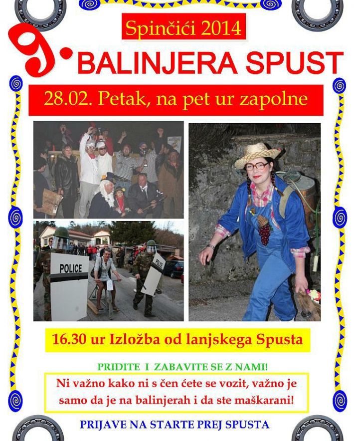 U sklopu manifestacije PUST VA KASTVE 2014. organizirano je otvaranje izložbe fotografija '8. Balinjera spust', autora Branka Kukurina, Željka Šepića i Darka Trbovića, a koja će se održat u petak, 8. veljače u Kalamiti (Spinčići), s početkom u 16:30 sati. Izložba se od 1. do 5. ožujka može pogledati svakodnevno u Art caffeu u Kastvu. Nakon izložbe prisustvujte '9. Balinjera spustu Spinčići 2014.', koji u 17,00 sati započinje nastupom Glazbenog društva Spinčići, a u 17,15 sati održati će se i službeni trening. Start Balinjera spusta je u 17,30 sati. Prijavite se na licu mjesta! Prijavite se, jer nisu važne ni godine, a ni spol, nije važno što ćete voziti, važno je samo da je na Balinjerama i da ste maskirani! Za sve sudionike spusta organizatori su pripremili fažol i dobru zabavu. U slučaju obilnije kiše Balinjera spust će, na žalost, biti otkazan.
