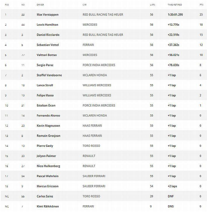 Lewis Hamilton je na VN Malezije u Sepangu krenuo s najbolje startne pozicije, ali nije uknjižio još jednu pobjedu. Max Verstappen u Red Bullu iz utrke u utrku je sve brži i brži, a premda je startao utrku kao treći pobrinuo se za iznenađenje, već u četvrtom krugu prestigao je vodećeg Hamiltona i obranio vodstvo sve do kraja utrke. Dakle to nije više senzacija, nego normalna stvar da je Verstappen i bolid Red Bulla jako, jako brz. Max Verstappenu to je druga pobjeda u karijeri, poslije prve lani za VN Španjolske. Odlični rezultat Red Bulla upotpunio je i njihov drugi vozač Daniel Ricciardo koji je utrku završio na pobjedničkom podiju kao treći. Svjetski prvak Lewis Hamilton (Mercedes) drugim mjestom tako je ipak povećao svoje vodstvo u ukupnom poretku. Jer, Ferrari je na VN Malezije imao katastrofalan vikend. Prvo je Vettel zbog zamjene motora i neodrađenih kvalifikacija startao sa začelja kolone, ali je na kraju vrlo dobrom vožnjom ipak došao do četvrtog mjesta. Raikkonen premda je trebao startati kao drugi, to se nije dogodilo nije ni startao na utrci nakon što mu se bolid pokvario u krugu zagrijavanja. VN Malezije, koja se vozi od 1999. godine, iduće sezone neće biti u F1 kalendaru. Iduća utrka ove sezone vozi se 8.10.2017. za VN Japana.