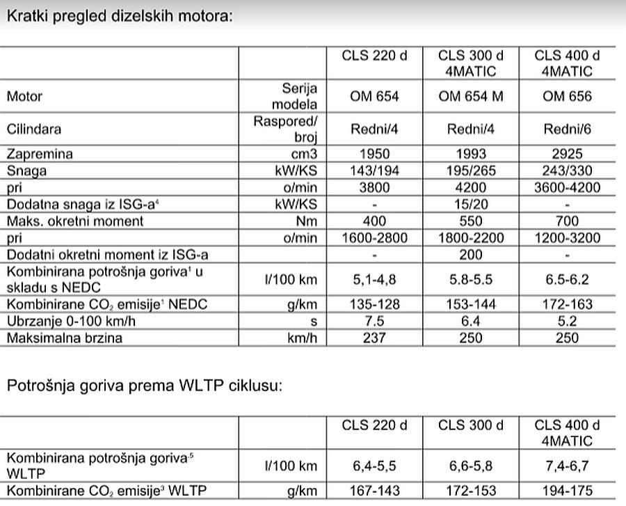 AMG DYNAMIC PLUS paket (za ponudu opreme, vidi gore) također je dio serijske opreme ovog Edition modela. Kada se otvore prednja vrata, LED tehnologija se koristi za 3D projiciranje AMG amblema na tlo pored vozila. Unutarnje značajke sportskog posebnog modela: AMG nappa koža u dva tona boje, crna/srebrna siva biserna, AMG ukrasni elementi od karbonskih vlakana, upravljač presvučen nappa kožom i DINAMICA mikro vlaknima s kontrastnim gornjim šavovima kao i AMG tipkama na upravljaču te AMG natpisom na središnjoj konzoli. Pogonski sklopovi modela CLS: snažni i učinkoviti Uz poznate benzinske modele, model CLS 300 d 4MATIC koji je predstavljen u ožujku 2021. (kombinirana potrošnja goriva 5.8-5.5 l/100 km; kombinirane CO 2 emisije 153-144 g/km) 2 ima blago hibridni pogonski sklop. Njegov četiri-cilindrični dizelski motor (OM 654 M) dolazi s integriranom drugom generacijom integriranog startera-generatora i 48-voltnim električnim sustavom. Snaga sustava je 195 kW uz 15 kW iz električnog motora. Obnavljanje kinetičke energije i mogućnost ”krstarenja” s isključenim motorom čine ovaj pogonski sklop vrlo učinkovitim. Elektrifikacija također omogućuje uporabu električnog kompresora rashladnog sredstva za sustav klima uređaja. Ovdje je dan pregled najvažnijih značajki: