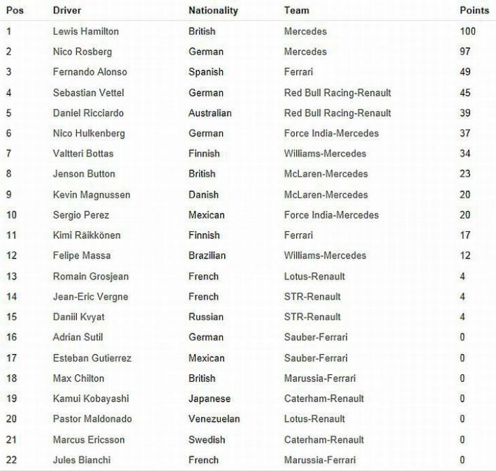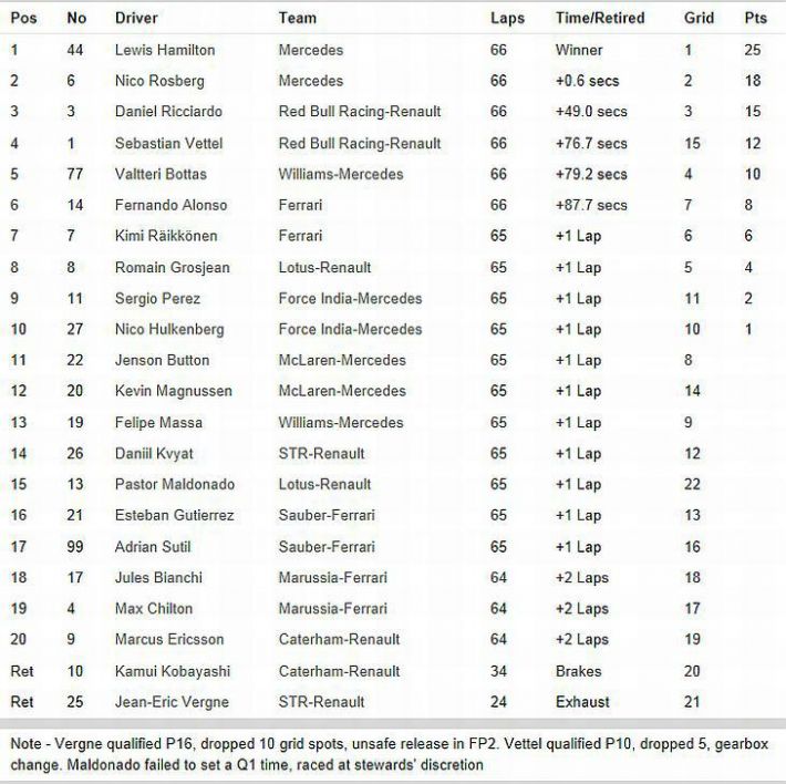 Rekli smo kako je utrka bila dosadan s malo događanja, nije bilo sudara, a zanimljivo je i kako nije bilo odustajanja bolida zbog tehničkih problema, ali s druge strane svi bolidi, osim Mercedesovih, su brzi kao puževi i to je ono što brine, jer u sporom bolidu i nema pravog utrkivanja i pretjecanja. Poslije prve trećine utrke i 22 odvoženih krugova svi su otišli na prvi odlazak u boks po nove gume u poretku – Hamilton, Rosberg, Ricciardo, Grosjean, Raikkonen, Alonso, Massa i kao deveti Vettel. I tako su bolidi i dalje kružili i obavili i drugi odlazak u boks bez značajnijih promjena u pretku, a onda je u izrazito dosadnu utrku došlo malo živosti 10 krugova prije kraja. Stvorila su se tri para u Top 10 koja su se međusobno počeli juriti. Drugi Rosberg vozio se skoro pa na mjenjaču prvog Hamiltona, sedmi Alonso pritiskao je petog Raikkonena, a peti Vettel agresivan je bio prema četvrtom Bottasu. I tri kruga prije kraja sve se razriješilo, Vettel je lakoćom došao do četvrtog mjesta (ne zaboravimo u kvalifikacijama je bio tek 10., a dobio je i minus pet mjesta kazne zbog novog mjenjača pa je startao s 15. pozicije). Tek malo teže Alonso je prešao svog momčadskog kolegu Raikkonena za šesto mjesto, što je bio i krajnji realni domet Ferrarijevog bolida u ovoj utrci. Rosberg je bio na repu Hamiltona, bio je brz, ali i ne dovoljno brz, jer nije imao prave prilike napasti vodećeg Hamiltona, tako da treba s više agresije pričekat neku drugu priliku.