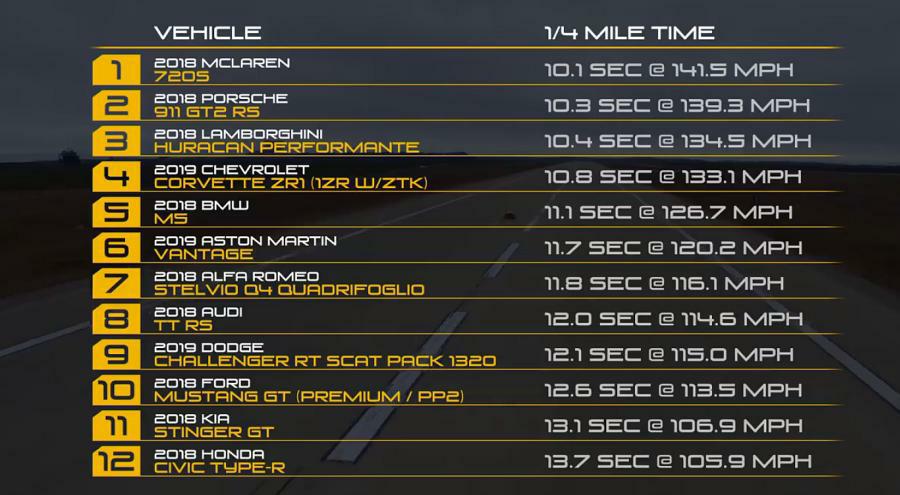 Kada se na jednom mjestu okupi impozantna ergela fenomenalnih automobila, onda se treba očekivati i nešto posebno. Ekipa Motor Trenda na jednom mjestu je okupila ove automobile: McLaren 720S, Porsche 911 GT2 RS, Honda Civic Type R, Lamborghini Huracán Performante, BMW M5, Ford Mustang GT PP2, Alfa Romeo Stelvio Q4 Quadrifoglio, Kia Stinger GT, Audi TT RS, Chevrolet Corvette ZR1, Mazda MX-5 Club i Aston Martin Vantage.