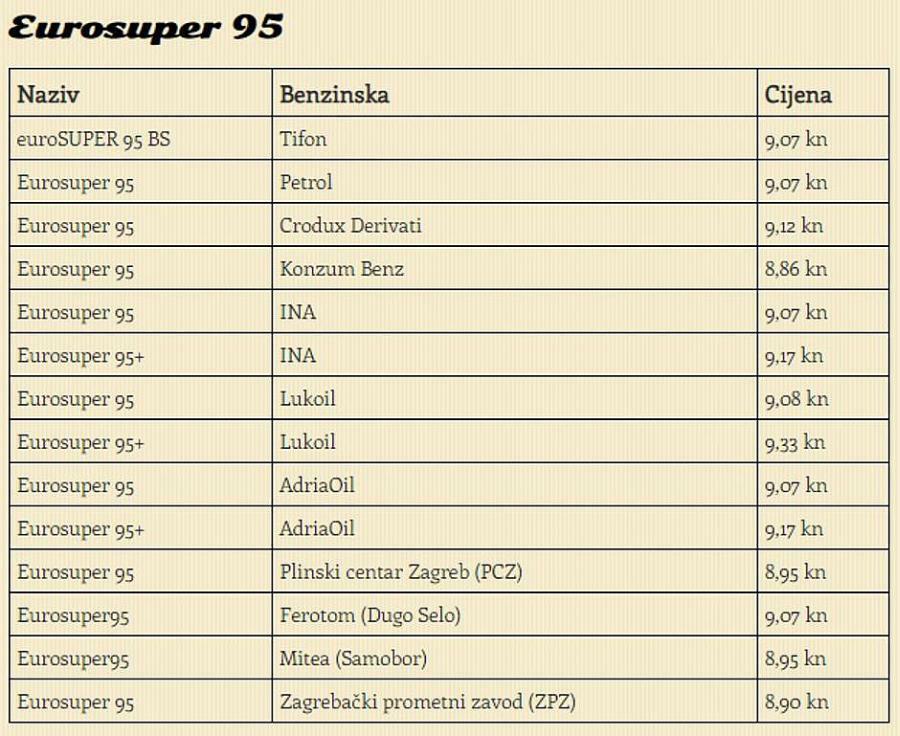 cijena Eurosupera 95 kreće se od 8,86 do 9,12 kuna za litru