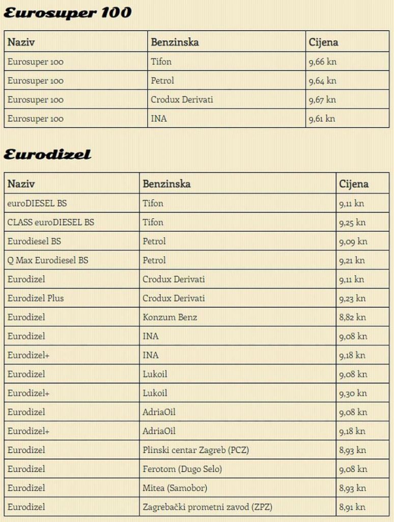 cijena Eurosupera 100 kreće se od 9,64 do 9,66 kuna za litru