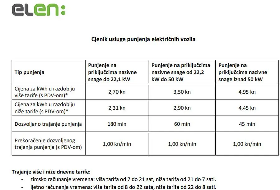 Na punionicama snage do 22 kW, iznosi 2,70 kuna kod više tarife i 2,31 kune kod niže tarife uz najveće dozvoljeno punjenje od 180 minuta. Ako prekoračite to ograničenje svaka se dodatna minuta naplaćuje jednu kunu.