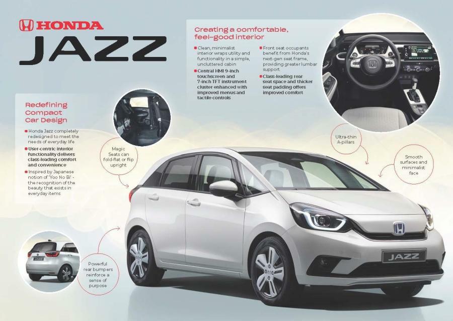 Za ugradnju novog hibridnog pogona s dva motora – koji je prvi put uključen u standard – uz zadržavanje neusporedive prostranosti i izvanredne razine komfora, potrebne su nove napredne strukturne tehnologije. Niz inovacija, razvijena u suradnji s dizajnerima interijera i vanjskog dizajna, omogućila je skraćivanje nosa i pomicanje kabine naprijed, omogućujući maksimalan prostor u unutrašnjosti. S prepolovljenom debljinom stupa, dizajneri Jazza pojačali su osjećaj prozračnosti u kabini za sve putnike. Preko panoramskog vjetrobranskog stakla i prednjeg dijela stakla, obilje prirodnog svjetla, koje vozaču i suvozaču pružaju široko vidno polje. Jazz ima ravan pod za ugradnju svojih praktičnih stražnjih čarobnih sjedala. Ova genijalna konfiguracija omogućava da se sjedala poklope, nudeći optimalnu svestranost za prihvat tereta raznih oblika i veličina. Šire otvaranje prtljažnika i novi, besprijekoran ravan pod olakšava utovar i istovar iz prtljažnika nego ikad. Sljedeća generacija Jazz hibrida, koji će u Europi biti dostupna u ljeto 2020., dodatno će istaknuti opredjeljenje Honde da svi modeli u Europi postanu električni do 2022. godine.