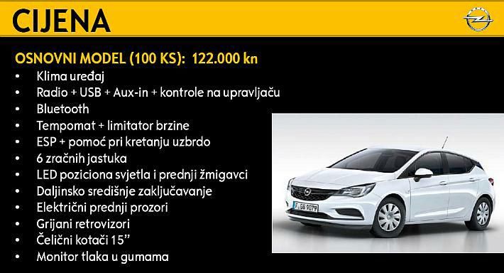 Pokreće je nova generacija motora, 1,0 trocilindrični turbo 105 KS, 1,4 četverocilindrični turbo 125 i 150 KS, 1,6 četverocilindrični 200 KS benzinski motori, te dizelski 1,6 CDTI sa 95, 110 i 136 KS. Nova Opel Astra je prvi kompaktni automobil koji ima Adaptivna LED Matrix svjetla (doplata 9500 kuna). Nova Opel Astra starta modelom od 100 KS i cijenom od 122.000 kuna.