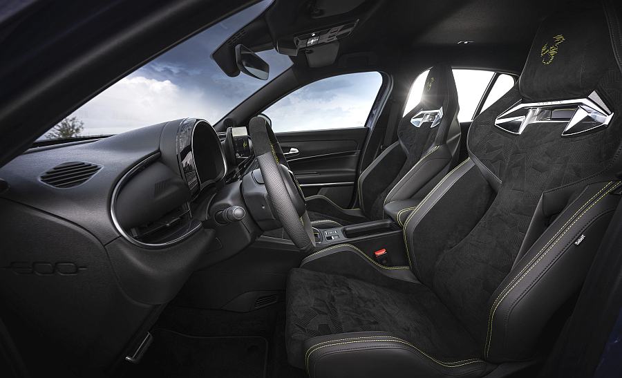 U unutrašnjosti, sjedala dvije verzije modela Abarth 600e malo se razlikuju, s dvije različite konfiguracije koje odražavaju duh svake verzije. Prekriven Scorpionflageom, prepoznatljivim i ekskluzivnim uzorkom stvorenim ikonom škorpiona, model Scorpionissima ima agresivnija, trkaća Sabelt sjedala od alcantare s integriranim naslonom za glavu koja su perforirana kako bi izrazila više lakoće i sportskog duha; u međuvremenu, sjedala modela Abarth 600e Turismo Sabelt dolaze s integriranom tkaninom za naslone za glavu s prugastim dizajnom. Osim toga, ograničeno izdanje Scorpionissima ima grijana sjedala i vjetrobranska stakla kako bi se bolje nosila s hladnim zimskim danima.
