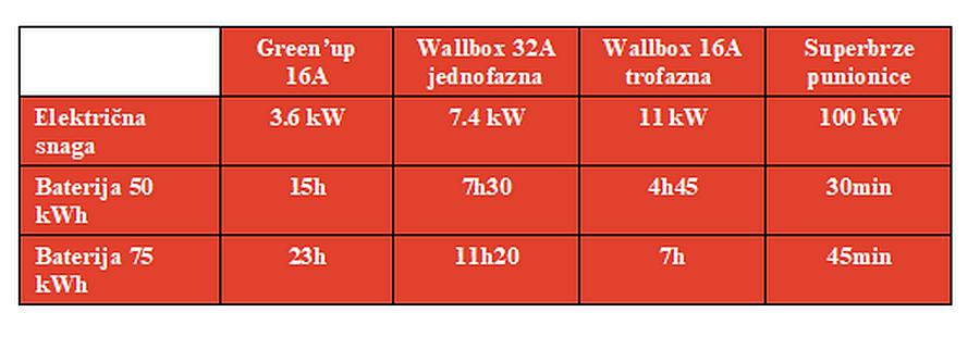 Baterija snage 50 kWh postiže kapacitet od 80% u 30 minuta punjenja dok baterija od 75 kWh za 45 minuta.