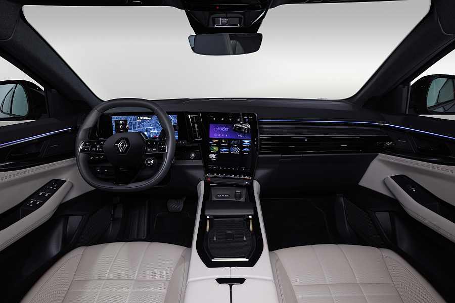 Novi Espace učvršćuje vodeći položaj i status prethodnih generacija. Kvaliteta završne obrade vidljiva je već na prvi pogled, a očaravajući putnički prostor može se pohvaliti sveobuhvatnom opremom. Početna razina opreme Techno dostupna je 24-inčnim zaslonom OpenR, električnim poklopcem prtljažnika, bežičnim punjačem pametnog telefona, 19-inčnim naplatcima, Isofix pričvrsnim točkama za lijevo i desno sjedalo u drugom redu te paketom sigurnosnih značajki, uključujući upozorenje na vozilo u mrtvom kutu.Inačica Esprit Alpine nova je u ponudi Espacea, a odlikuje se sportskim ozračjem u unutrašnjosti. U naslone za glavu utisnut je logotip u obliku slova A i strelice, obloge armaturne ploče od Alcantare ukrašene su plavim šavovima, a sjedala su presvučena profinjenom i skladnom kombinacijom Alcantare, umjetne kože i tkanine Latis Bright. Inačica Iconic može se pohvaliti novom razinom luksuznog uređenja koje uključuje umetke od pravog drva jasena na armaturnoj ploči, podstavljene kožnate presvlake svijetlosive boje Sand i Mokka smeđe obloge. Sjedala ove inačice imaju funkciju grijanja (kao i upravljač) te ih je moguće električno podesiti prema duljini, visini i nagibu. Vozačevo sjedalo opremljeno je i funkcijom masaže donjeg dijela leđa.