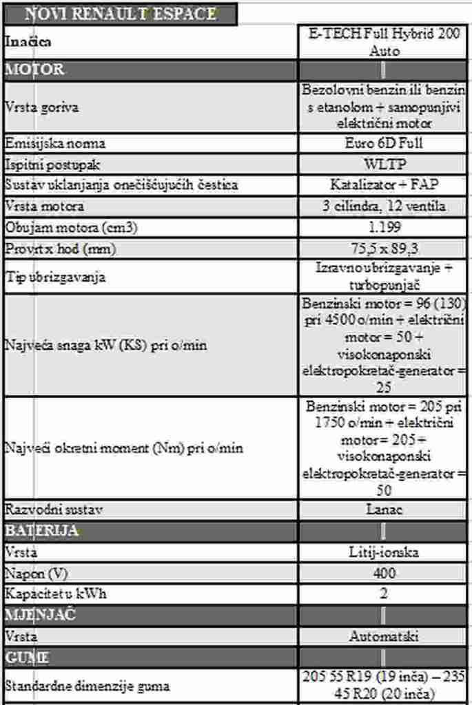 Espace je započeo revoluciju, predstavio viziju budućnosti i neprestano se mijenjao u skladu s vremenom. Da je tomu doista tako, svjedoči atletski i elegantan izgled nove generacije po uzoru na SUV-ove, dok inačica Esprit Alpine unosi dašak nepatvorenog sportskog duha. Vjeran genima svojih prethodnika, Espace je i dalje dugačko vozilo s 5 ili 7 sjedala te najprostraniji model u ponudi marke. I u tom je pogledu sjajan! Izbor profinjenih materijala i završnih obrada čini ga prilično otmjenim, a tu su i druge vrhunske karakteristike poput najvećeg panoramskog krova na tržištu (površine 1 m2). Povrh toga, putnički prostor i motor novog Espacea mogu se pohvaliti najnovijim naprednim tehnologijama koje osiguravaju maksimalnu povezanost u vozilu te pomažu smanjiti okolišni otisak. U usporedbi s prethodnom generacijom, novi Espace ima manje vanjske dimenzije, lakši je 215 kg te je opremljen iznimno učinkovitim punim hibridnim motorom E-Tech snage 200 KS. Njegova nenadmašno niska potrošnja goriva (4,6 l/100km) zaslužna je za doseg do 1.100 km, pri čemu nije potrebno puniti bateriju.