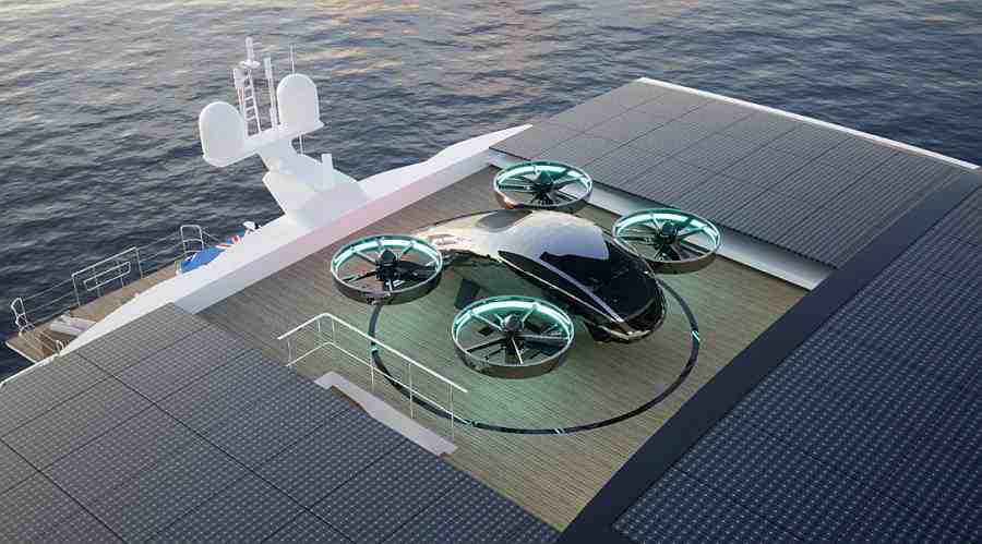 „Također gradimo naše brodove na solarnu energiju i električni pogon, a to znači da ne moramo dati puno prostora strojarnici, što znači da dobivamo prostor za stvari poput teretane ili dodatnog spremišta. Konačno, dodatna širina oblika katamarana znači da krov može primiti eVTOL zrakoplov. Možemo ga priključiti na brodu i napunit će se za nekoliko sati.