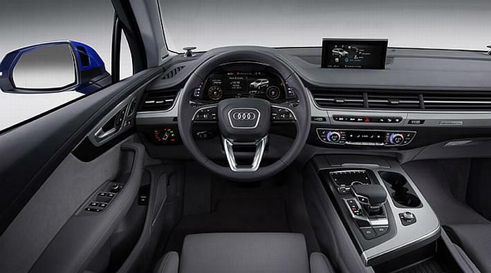 Zaokružujući element, koji se proteže od vrata preko ploče sa instrumentima i formira neku vrstu štita, vozaču i putnicima pruža osjećaj zaštite. Kontrole su skrojene specifično za Audi Q7. One se nalaze na središnjoj konzoli koja je okrenuta prema vozaču. Oblici i konture kontrola dobro su usklađene s arhitekturom unutrašnjosti. Linije ventilacijskih otvora usmjerene su prema ploči sa instrumentima i dodatno potiču orijentaciju prema vozaču. Za ambijentalno osvjetljenje koristi se samo LED rasvjeta. Kao alternativa, dostupna je druga varijanta ambijentalnog osvjetljenja. U ovom slučaju jako uske svjetlosne trake slijede konture prednje ploče i vrata (uključujući upozorenja na izlazak), dok u paketu više također slijede konture središnjeg tunela. Sada se ovo osvjetljenje po prvi put može kontrolirati preko MMI sučelja. U top paketu mogu se odabrati razne boje. Uz boje i materijale koji se koriste u modelu Q7, Audi prikazuje novi izričaj lakoće, sportske note i luksuza u ovom premium SUV segmentu. Prednja ploča je vodoravno razdvojena u dvije boje, što omogućuje uporabu svjetlijih boja u donjem dijelu. Moguće je odabrati jednu od sedam boja. Dvodijelni dekorativni umetci dostupni su u raznim kombinacijama boja. Osim visokokvalitetnih finiša, postoji nekoliko varijanti od aluminija i drveta, uključujući Beaufort lješnjak dezen. Za presvlake sjedala Audi nudi tkaninu, Alcantaru, robusnu Cricket kožu i finu Valcona kožu. Za kupce koji traže više individualnosti Audi nudi tri kožna paketa i dva dizajnerska rješenja. Jedan elegantni i jedan sportski dizajn uključuju kompletne kožne presvlake s kontrastnim vezom, obrubom od Alcantare, luksuzne velur podne prostirke i ekskluzivne kombinacije boja i materijala, te dekorativne umetke. Audi exclusive ponuda nudi mnogo dodatnih opcija za prilagođavanje.