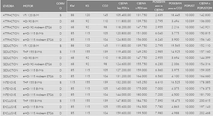 – u dizelske motore ugrađena je tehnologija Stop&Start (osim HDi 90 s ručnim mjenjačem).