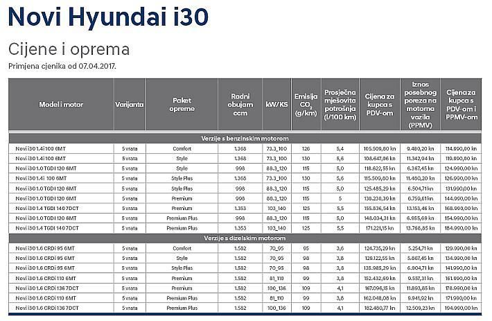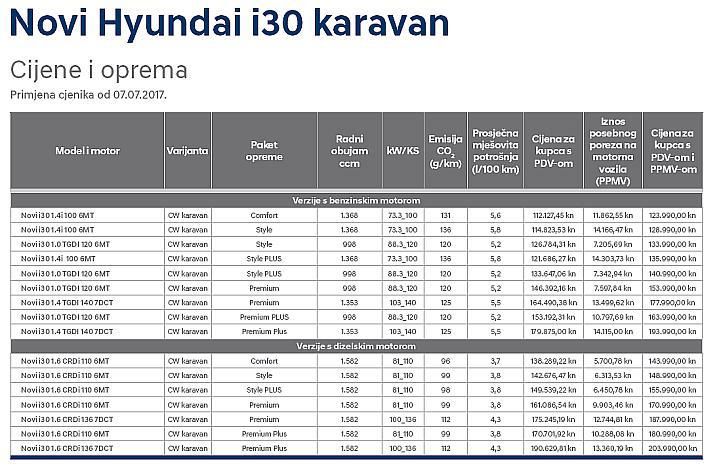 Karavanska izvedba modela i30 1.4i dostupna je već od 123.990 kuna, uz akcijsko financiranje s 0% kamata, u bogatom paketu opreme Comfort. Akcijsko financiranje s 0% kamata, u suradnji s Erste&Steiermärkische S-Leasing d.o.o., odnosi se na model 50/50 uz 0% kamata i 0% troškova obrade te na model 1/3 uz 0% kamata i 0,99% troškova obrade.