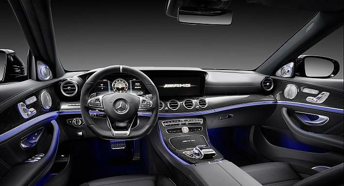 Unutrašnjost pojačava konzistentno dinamičan dojam s raznim specijalno dizajniranim detaljima. Idealno za sportski stil vožnje, performance sportski upravljač presvučen crnom kožom ima podrezani donji dio, Touch Control tipke i elektro-presvučene poluge mjenjača, kao i umetak s AMG logotipom. Zahvaljujući boljem bočnom držanju, vozač i suvozač uživaju u sigurnom položaju u prednjim sportskim sjedalima čak i pri visokim brzinama. U ponudi su prepoznatljive presvlake sjedala u kombinaciji crne nappa kože/DINAMICA mikro-vlakana, lješnjak smeđoj nappa koži ili macchiato nappa koži. Obloge u vratima odgovaraju presvlakama sjedala. Kao opcija mogu se naručiti AMG Performance sjedala s integriranim naslonima za glavu. Umetci od aluminija s trapezoidnim uzorkom ističu sportske aspiracije. U modelu E 63 S 4MATIC+, unutrašnjost je još dodatno profinjena. Istaknute značajke uključuju prednju ploču i bočne obrube presvučene nappa kožom, sportski upravljač s kristal sivom oznakom ”12 sati” i kontrastnim gornjim šavovima, AMG logotipi u naslonima prednjih sjedala, kristal sive obrube sjedala, IWC dizajnerski analogni sat i sigurnosne pojaseve u kristal sivoj boji. AMG ploča s instrumentima sve bitne informacije prikazuje u vidnom polju vozača. Instrumenti s izgledom ciljne zastave i prepoznatljivom topografijom velikim, jasno čitljivim prikazima pružaju posebno sportski dojam. Široki multifunkcijski zaslon s dva monitora dio je standardne opreme modela E 63 S 4MATIC+ i kao opcija je dostupan za model E 63 4MATIC+. Klijenti sa strašću za moto sportom biti će zadovoljni RACETIMER uređajem za mjerenje vremena krugova na zatvorenim stazama.
