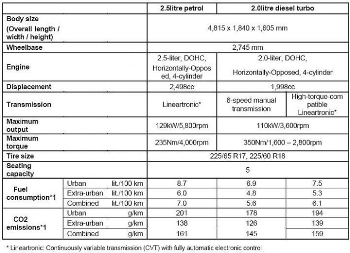 Dizelsku ponudu čini 2,0 litarski bokser turbo motor sa četiri cilindra. Iz obujma 1.998 ccm motor razvija najveću snagu 110 kW (150 KS) pri 3.600 o/min i najveći okretni moment 350 Nm u rasponu od 1.600 fo 2.800 o/min. Za prijenos snage zadužen je Lineatronic mjenjač (CVT mjenjač s bezstupnjevanim prijenosom i punom elektronskom kontrolom) ili ručni mjenjač sa šest stupnjeva prijenosa. Potrošna benzinskog motora s ručnim mjenjačem je u gradu 6,9 l/100km, izvan grada 4,8 l/100km i kombinirano 5,6 l/100km, uz emisiju ugljičnog dioksida od 145 g/km. Potrošna benzinskog motora s Lineatronic mjenjačem je u gradu 7,5 l/100km, izvan grada 5,3 l/100km i kombinirano 6,1 l/100km, uz emisiju ugljičnog dioksida od 159 g/km. Dizelski motor s ručnim mjenjačem do stotke sprinta za 9,7 sekunde i potegne do najveće brzine 200 km/h. A automatskim Lineatronic mjenjačem sprinta za 9,9 sekunde i potegne do 192 km/h.