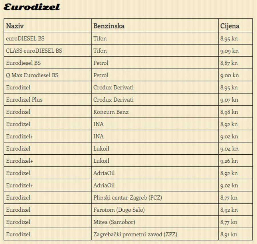 cijena Eurodizela kreće se od 8,77 do 9,00 kuna za litru