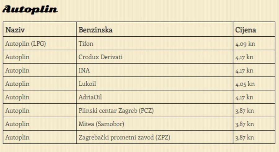 cijena autoplina kreće se od 3,87 do 4,17 kuna za litru