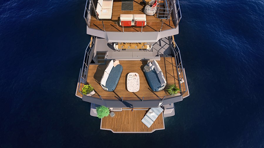Za one željne izlaska na vodu, tri preklopne platforme povećavaju raspoloživi prostor na palubi u klubu na plaži na 43 četvorna metra. Odjeljak za tendere s bočnim utovarom također može smjestiti dizelski tender od 6,25 metara.