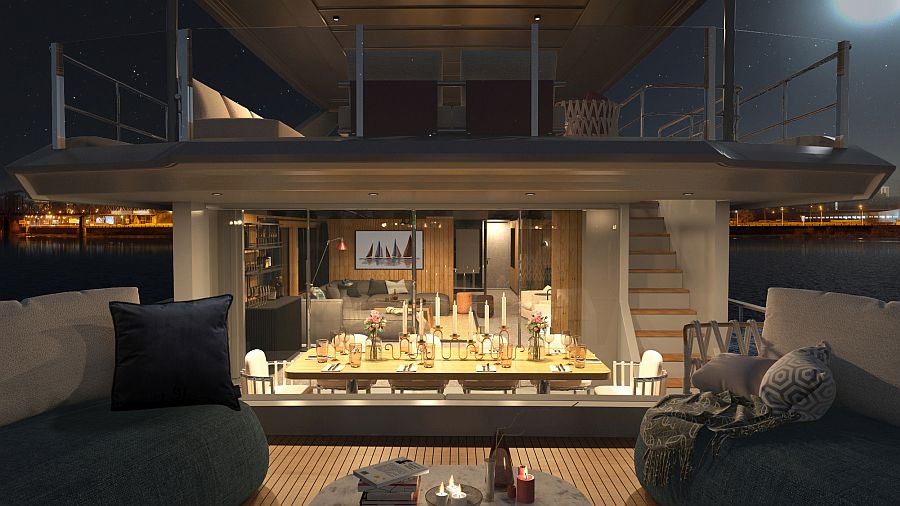 S točnim rasporedom 30XP koji se može prilagoditi zahtjevima pojedinačnih vlasnika, ima dovoljno prostora za blagovanje na otvorenom na krmenoj palubi kao i na natkrivenoj palubi za sunčanje. Dizajn jahte daje prednost stvaranju snažne veze s vanjskim prostorom. Uz privatni balkon kojem se pristupa preko glavnog apartmana koji je savršeno mjesto za uživanje u spokoju okolnih zaljeva, druga istaknuta područja na brodu 30XP uključuju uredski prostor u glavnoj kabini. Ovo ima veliki radni stol okrenut prema prozorima pune veličine za krajnje mirno radno okruženje. Osim toga, gosti također mogu uživati u izdašnom prostoru za glavu njezinog poluotvorenog beach cluba na krmi, što je postignuto podizanjem palube iznad kako bi se stvorio namjenski prostor za odmaranje koji se nalazi samo tri koraka iznad razine glavne palube.