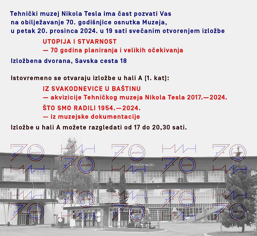 Tehnički muzej Nikola Tesla povodom svoje 70. godišnjice ima u petak 20. prosinca 2024. godine u 19 sati svečano otvorenje čak tri izložbe koje biste obavezno trebali pogledati