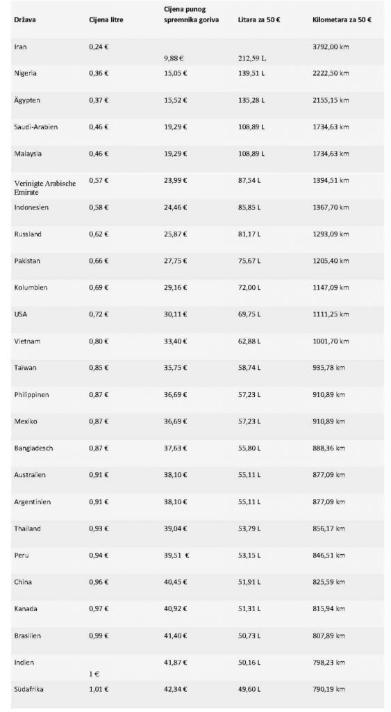 A da usporedimo s Njemačkom u kojoj litra benzina košta 1,43 eura, dobije se za 50 eura 34,99 litre benzina što je dovoljno za 555,22 km. Šteta kako u ovu zgodnu analizu nisu uvrstili i Hrvatsku, ali to smo mi dodali u proračun. U Hrvatskoj je cijena benzina za jednu litru oko 9,83 kune (1,33 eura), za 50 eura može se dobiti 37,59 litara benzina što je dovoljno za 596,66 kilometara. Nije ni tako loše ispalo, ali znamo da je to samo prividno s obzirom na razinu naših mjesečnih primanja.