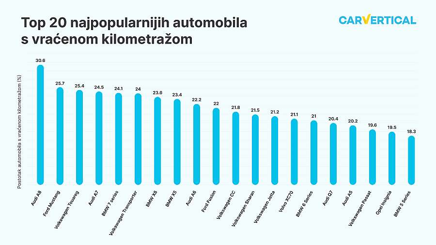 Tvrtka za povijest vozila carVertical analizirala je 1,11 milijuna izvješća o povijesti u posljednjih 12 mjeseci na 24 tržišta koja pokrivaju SAD i većinu Europe. Istraživanje je pokazalo da je automobil s najčešće vraćenom kilometražom luksuzna limuzina Audi A8. Od svih automobila Audi A8 provjerenih na platformi, 30,6% imalo je lažnu kilometražu, što znači da gotovo svaka treća rabljena Audijeva zvijezda nosi prevaru s kilometražom. Čak 6 od 10 automobila s najčešće vraćenom kilometražom bila su skupa njemačka vozila kao što je Audi A7, BMW X5, BMW serije 7 i Volkswagen Touareg. Njihova visoka cijena (a time i visok potencijal zarade) pretvara ova vozila u savršenu metu za prevarante na tržištu rabljenih automobila. Među modelima ostalih proizvođača na popisu automobila s najčešće vraćenom kilometražom su i Ford Mustang na 2. mjestu (25,7% automobila s vraćenom kilometražom), Ford Fusion na 10. mjestu (22% automobila s vraćenom kilometražom), Volvo XC70 na 14. mjestu (21,1% automobila s vraćenom kilometražom) i Opel Insignia na 19. mjestu (19,5% automobila s vraćenom kilometražom).