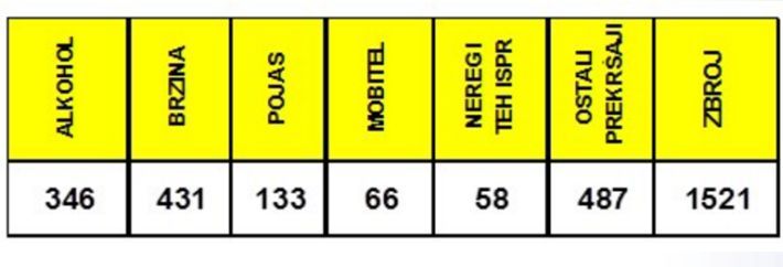 U dane provođenja akcije utvrđen je ukupno 1521 prometni prekršaj, od čega je 346 prekršaja vozača s alkoholom u krvi ili odbijanja alkotestiranja. Na mjestu prekršaja, kao mjera opreza oduzeto je 325 vozačkih dozvola, a iz prometa je isključeno 346 vozača. Kod 31 vozača (9%) alkotestiranjem je utvrđena koncentracija alkohola u organizmu veća od 1.5 g/kg ili su odbili alkotestiranje. Najviše zabilježene koncentracije alkohola kod vozača i vozačica su: