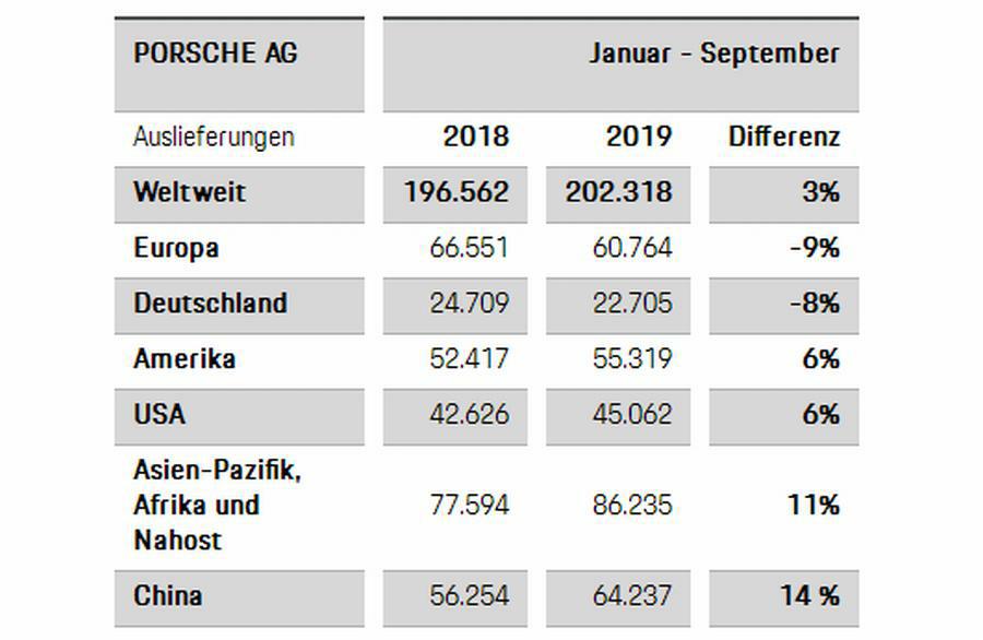 Tvrtka Porsche AG je u prva tri kvartala 2019. godine diljem svijeta isporučila 202.318 vozila. Time je proizvođač sportskih vozila ostvario porast od tri posto u odnosu na isto razdoblje u prethodnoj godini. Posebno tražene su bile serije modela Cayenne i Macan. Kod Cayennea je s 62.022 vozila i plusom od 25 posto ponovno zabilježen najsnažniji rast. Ovaj model je od nedavno u ponudi i kao Coupé varijanta – također kao plug-in hibrid. S druge strane, model Macan je 73.967 puta predan u ruke kupaca. To odgovara rastu od devet posto u usporedbi s prethodnom godinom.