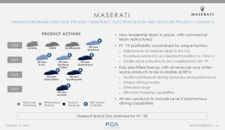 U sestrinskoj tvrtki Maserati vjerojatno je upitnik za Ghibli. Dobit će, kao i SUV Levante i veći Quattroporte 2020. godine facelift. Iako su nasljednici Quattroportea (2022.) i Levanta (2023.) dio planova, očekuje se da Ghibli ispadne. To je bilo tako, no, poslije spajanja FCA i PSA ti bi se planovi trebali ponovno napraviti. Sasvim je moguće da se novi, kompaktniji modeli, poput Tonalea, premjeste na PSA platformu, s potencijalom za potpunu elektrifikaciju. S obzirom na planirano prorjeđivanje modela trebalo bi biti spajanje s francuskim auto-gigantom, barem za Alfa Romea, osigurati bolje izglede za budućnost.