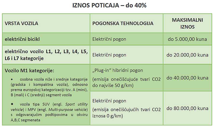 Nude se subvencije i za električne skutere, motocikale i četverocikle – do 20.000 kuna. Električni bicikli subvencioniraju se s do 5.000 kuna, a ‘plug-in’ hibridi (do 50 g/km CO2) s do 40.000 kuna.