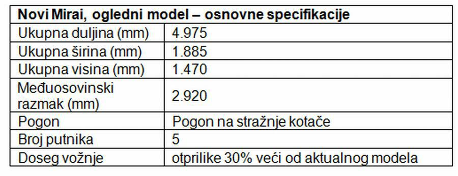 Yoshikazu Tanaka, Glavni inženjer za novi Mirai, kaže: „Cilj nam je bio stvaranje automobila koji će u kupcima probuditi želju da ga voze svo vrijeme, automobila koji ima emotivan i privlačan dizajn, kao i onu vrstu dinamičkih performansi i odziva koji navlače osmijeh na lice vozača.