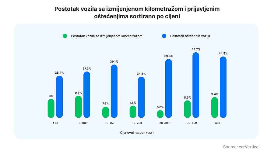 Iako je kupnja rabljenog automobila jeftinija od kupnje novog vozila iz autokuće, to može dovesti do dodatnih troškova. Prevare s kilometražom i skrivena oštećenja uobičajena su na tržištu polovnih automobila u Europu, što rezultira visokim troškovima održavanjima, povremenim mehaničkim kvarovima i sigurnosnim problemima. Istraživanje koje je u Hrvatskoj provela tvrtka za podatke o automobilima carVertical pokazuje da jeftiniji automobili u državi imaju više šanse za lažnu kilometražu. Čak 1 od 10 polovnih automobila u Hrvatskoj ima vraćenu kilometražu, što znači da su prevare s brojačem kilometara česte i vozači bi trebali biti oprezni pri kupnji vozila. Međutim, najveća je šansa da postanete žrtva prevare kada kupujete automobil između 5.000 i 10.000 EUR – 9,8 % svih vozila s ovom cijenom imalo je promjenu u kilometraži.